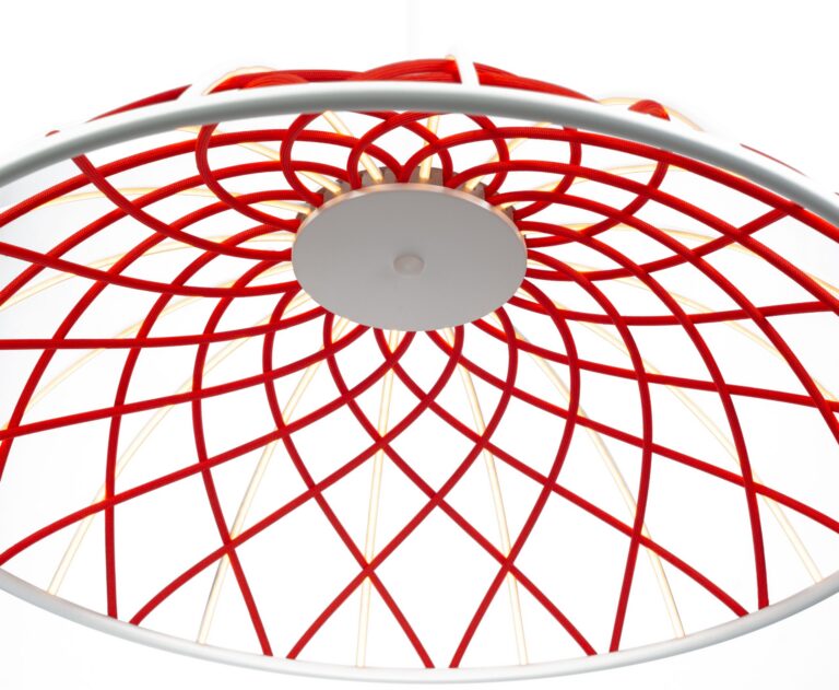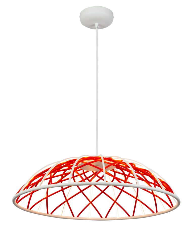 این لوستر نیمه کروی، رنگ بسیار خاصی هم دارد و در 2 سایز متفاوت موجود شده است. رنگ این لوستر ترکیبی از بدنه سفید+لولههای قرمز+سفید بافتهشده درخشان است.